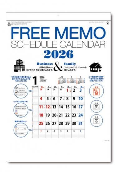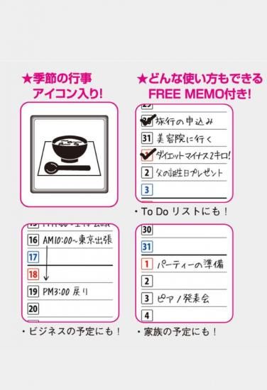 FREE MEMO欄に予定を書き込んだり今月の目標を記入して達成できればCHECK! 季節の行事アイコン入りで、月の行事も一目瞭然。